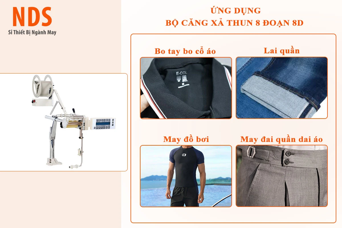 Bộ căng xả thun này là giải pháp hoàn hảo cho hầu hết các công đoạn may cần sử dụng dây thun, đặc biệt là các chi tiết bo tròn khó may. Các ứng dụng phổ biến bao gồm:
