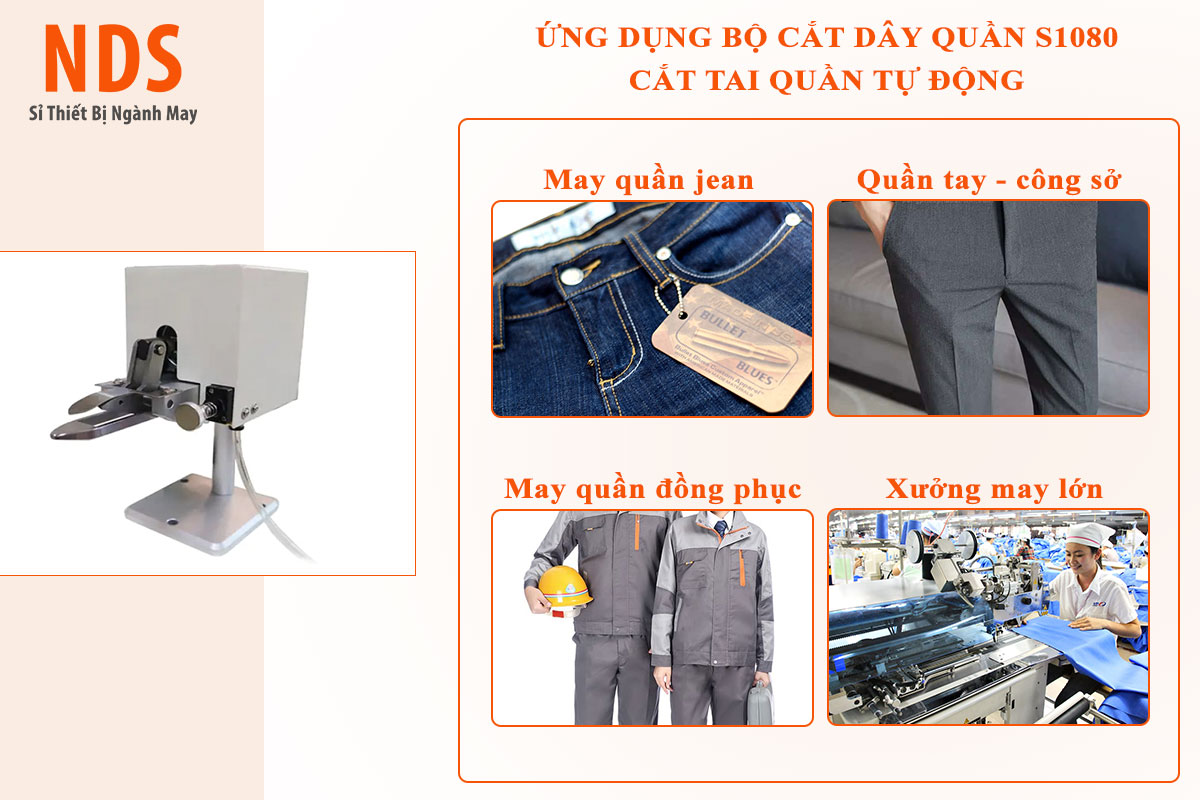 Bộ phụ trợ cắt dây quần S1080 là thiết bị chuyên dụng lắp kèm máy may công nghiệp, dùng để cắt tai quần (belt loop) tự động trong quá trình may. Sản phẩm giúp tăng tốc độ sản xuất, đảm bảo độ chính xác chiều dài tai quần và giảm phụ thuộc vào thao tác thủ công.