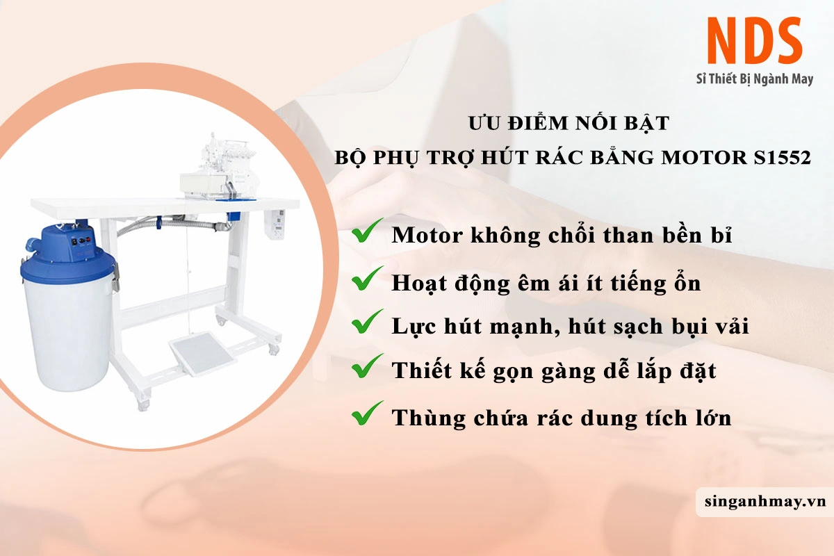 Bộ hút rác S1552 là thiết bị ngoại vi chuyên dụng, được thiết kế để lắp đặt đồng bộ với các dòng máy may công nghiệp (đặc biệt là máy 1 kim xén). Khác với các dòng hút rác truyền thống dùng khí nén tiêu tốn năng lượng, S1552 sử dụng hệ thống hút điện tử hiện đại, giúp thu gom triệt để vụn vải ngay khi dao xén hoạt động