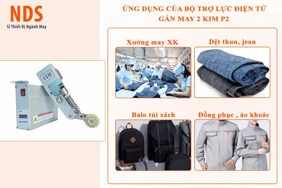 Bộ trợ lực điện tử gắn máy 2 kim P2 là thiết bị hỗ trợ lực kéo chân vịt cho máy may công nghiệp, giúp xử lý đường may khó, vải dày, thun co giãn hoặc nhiều lớp vải hiệu quả. Sản phẩm được yêu thích bởi khả năng hoạt động ổn định, tiết kiệm điện, tăng năng suất và giảm hiện tượng bỏ mũi