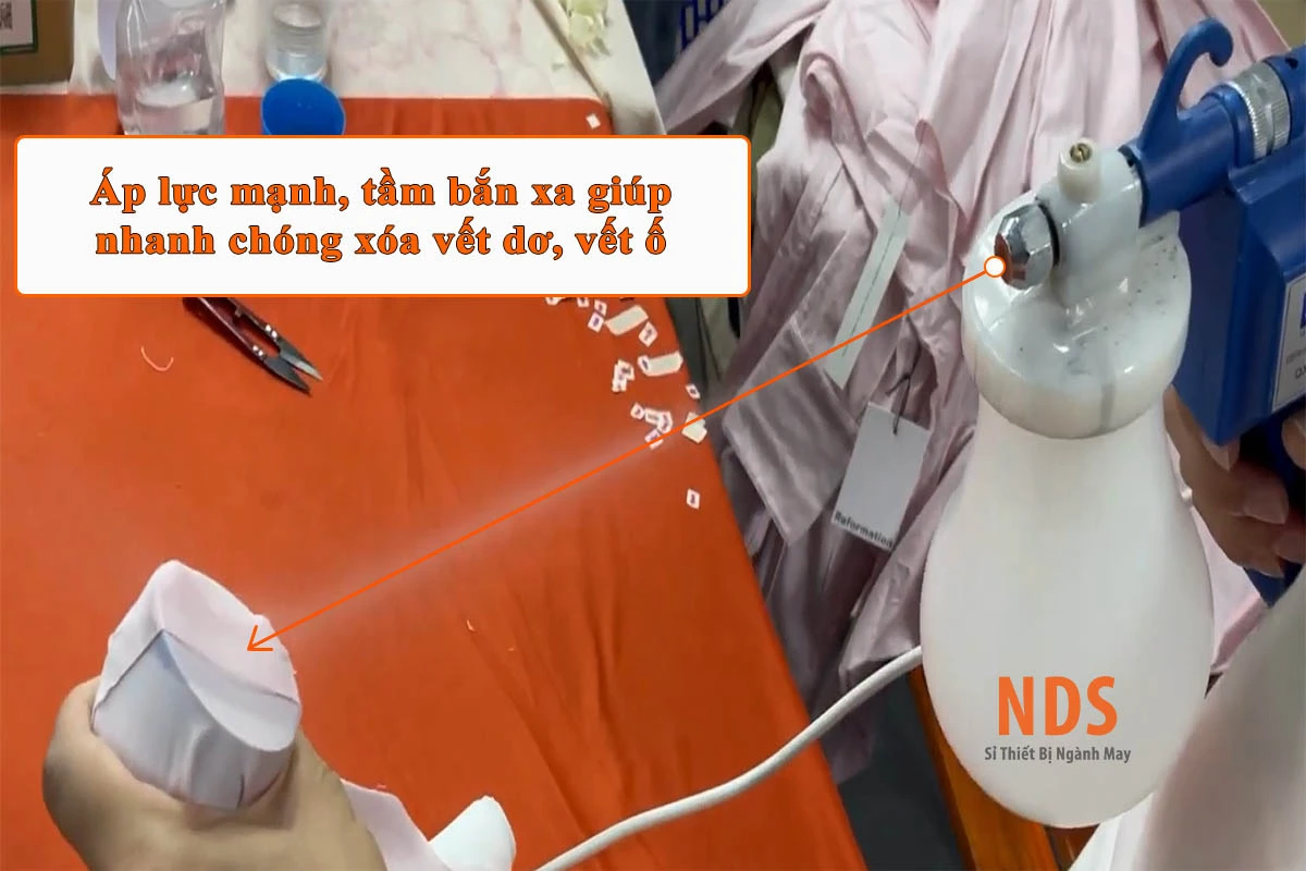 - Xóa bỏ dấu vết đánh dấu: Loại bỏ hiệu quả các loại phấn may, mực nước, mực xóa được sử dụng để vẽ rập, đánh dấu đường may, vị trí túi, cúc...