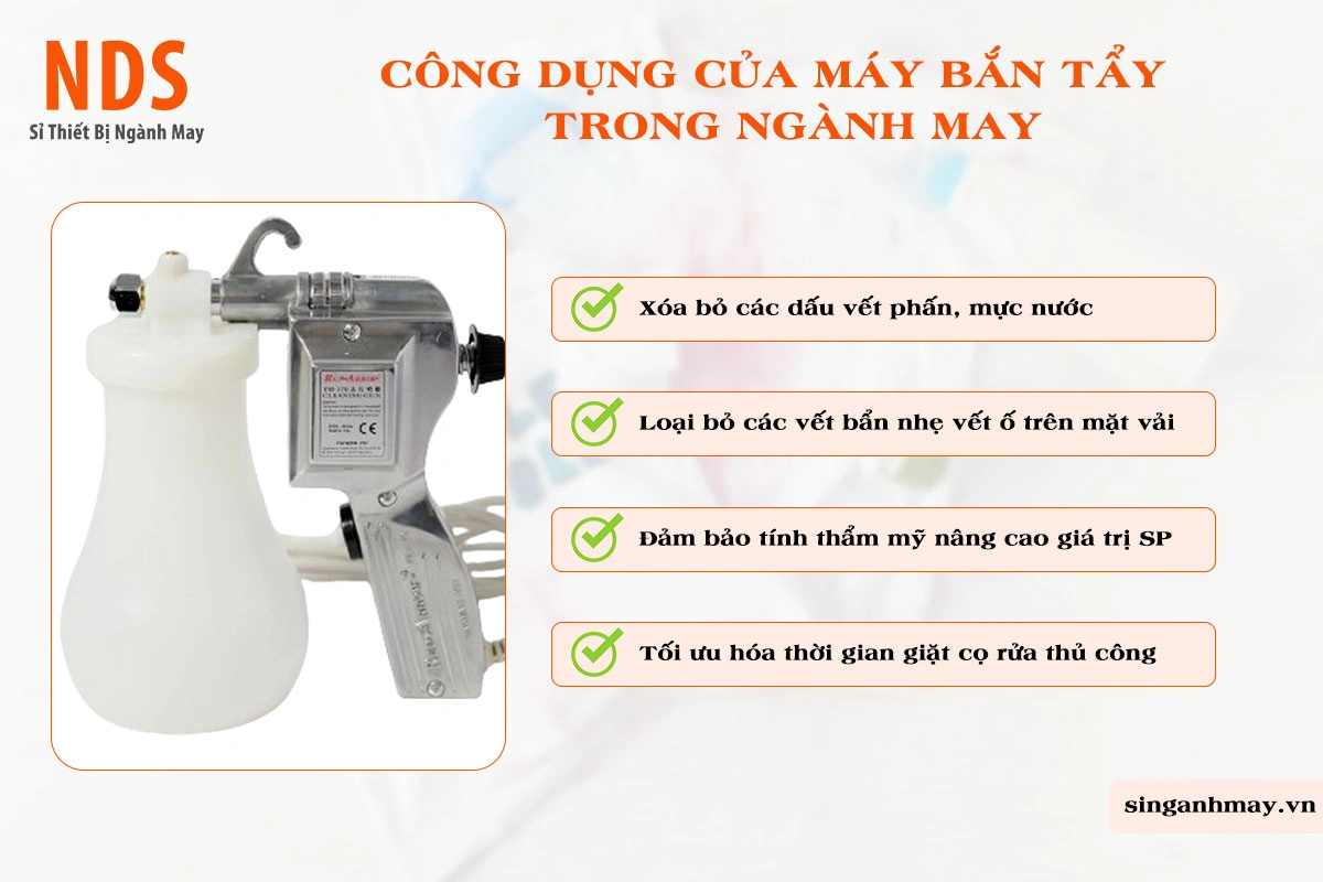 Trong ngành may mặc, máy bắn tẩy đóng vai trò quan trọng trong việc duy trì chất lượng sản phẩm. Các công dụng chính bao gồm:
