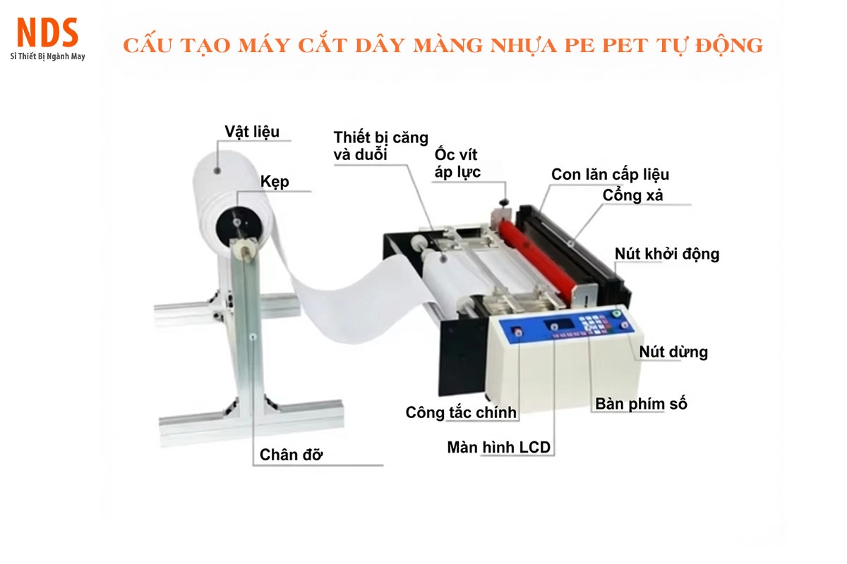 Máy cắt màng nhựa PE PET tự động là thiết bị chuyên dùng để cắt định hình tự động các loại vật liệu dạng cuộn, dải như màng nhựa (PET, PE, PVC), dây đai, nhãn chai lọ và các phụ liệu may mặc. Với lưỡi dao rộng 40 cm (400mm), máy có thể xử lý khổ vật liệu lớn, hoạt động hoàn toàn tự động dựa trên thông số cài đặt sẵn về chiều dài và số lượng. Thiết bị được trang bị màn hình điện tử, giúp cài đặt và vận hành trở nên dễ dàng, chính xác, phù hợp cho các xưởng sản xuất quy mô vừa và nhỏ