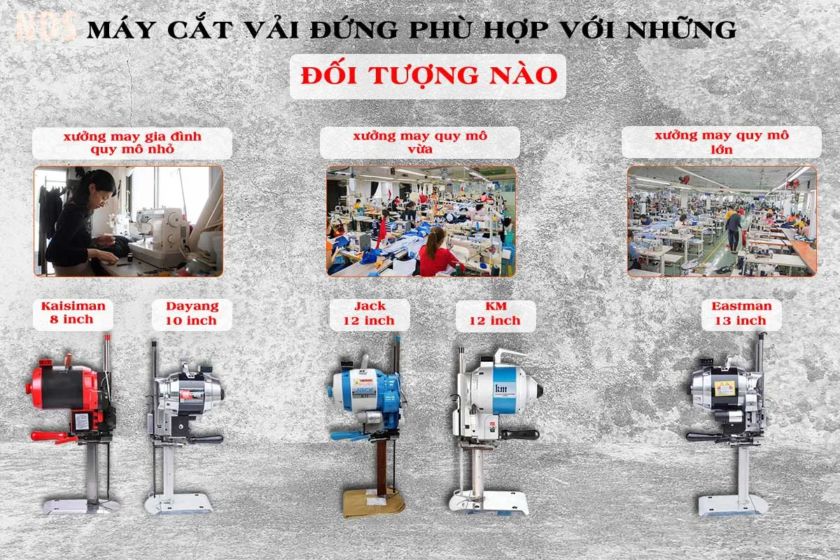 Xưởng may gia đình - quy mô nhỏ: Nên chọn máy cỡ 8 inch hoặc 10 inch (Kaisiman, Dayang) để cắt những đơn hàng số lượng vừa phải, tiết kiệm chi phí đầu tư