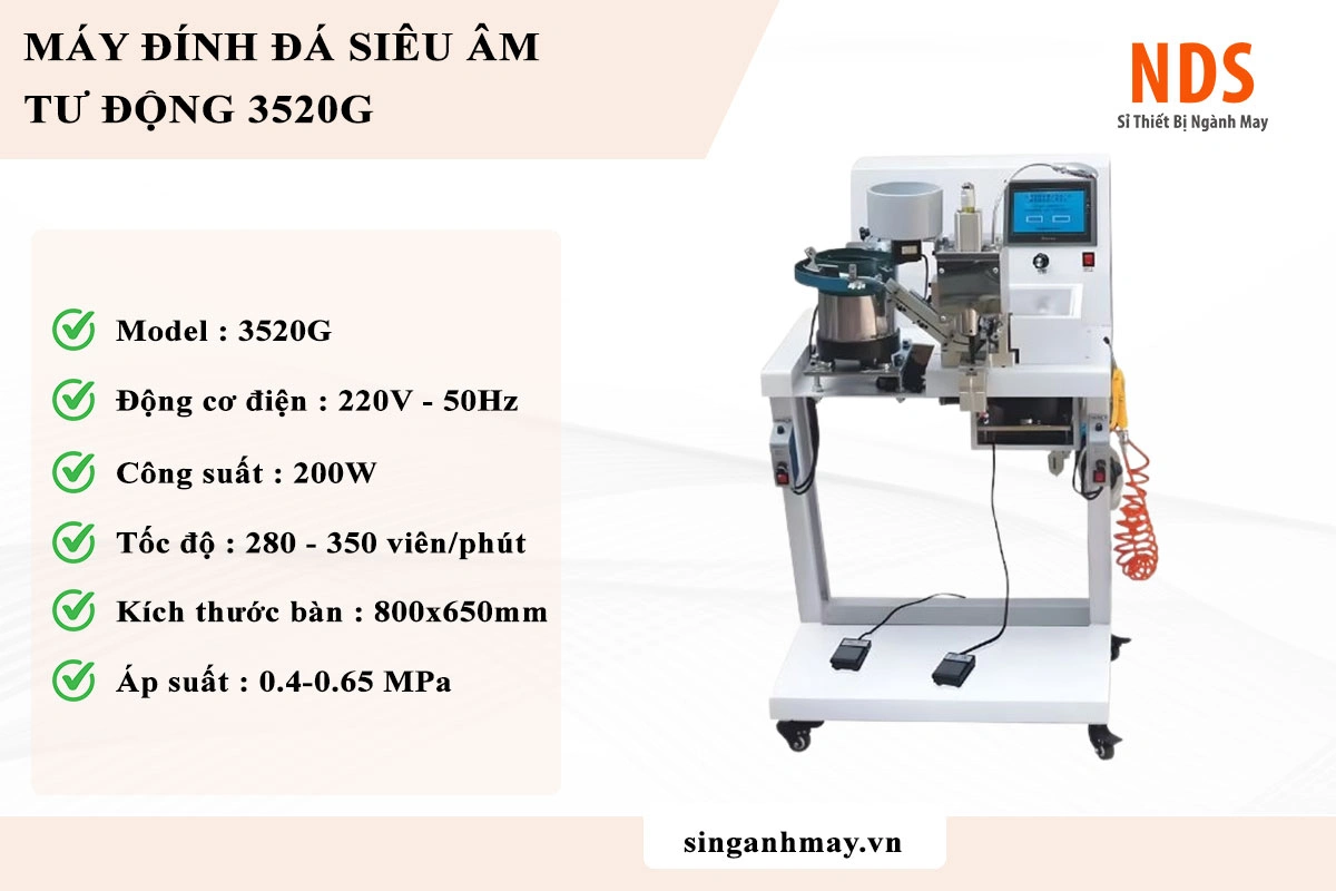 3520G là máy đính đá trang trí tự động dạng bàn, sử dụng công nghệ siêu âm ultrasonic để cố định đá lên vải. Máy vận hành bằng điện 220V, tốc độ đính khoảng 280–350 viên/phút, phù hợp cho xưởng may thời trang, áo dài, đầm dạ hội và sản phẩm trang trí cao cấp. Nhờ cơ chế siêu âm, đá được gắn chắc vào vải mà không cần keo, giúp sản phẩm giữ được độ bền sau nhiều lần sử dụng.