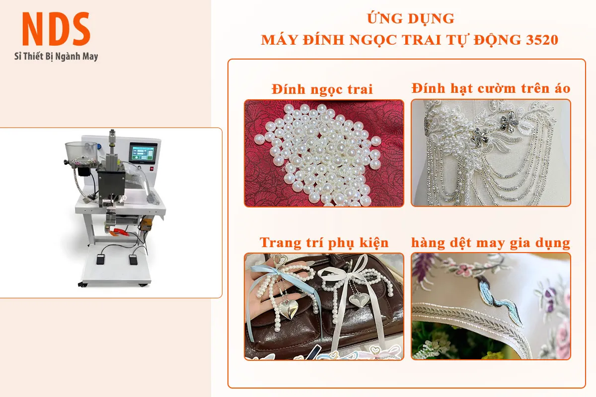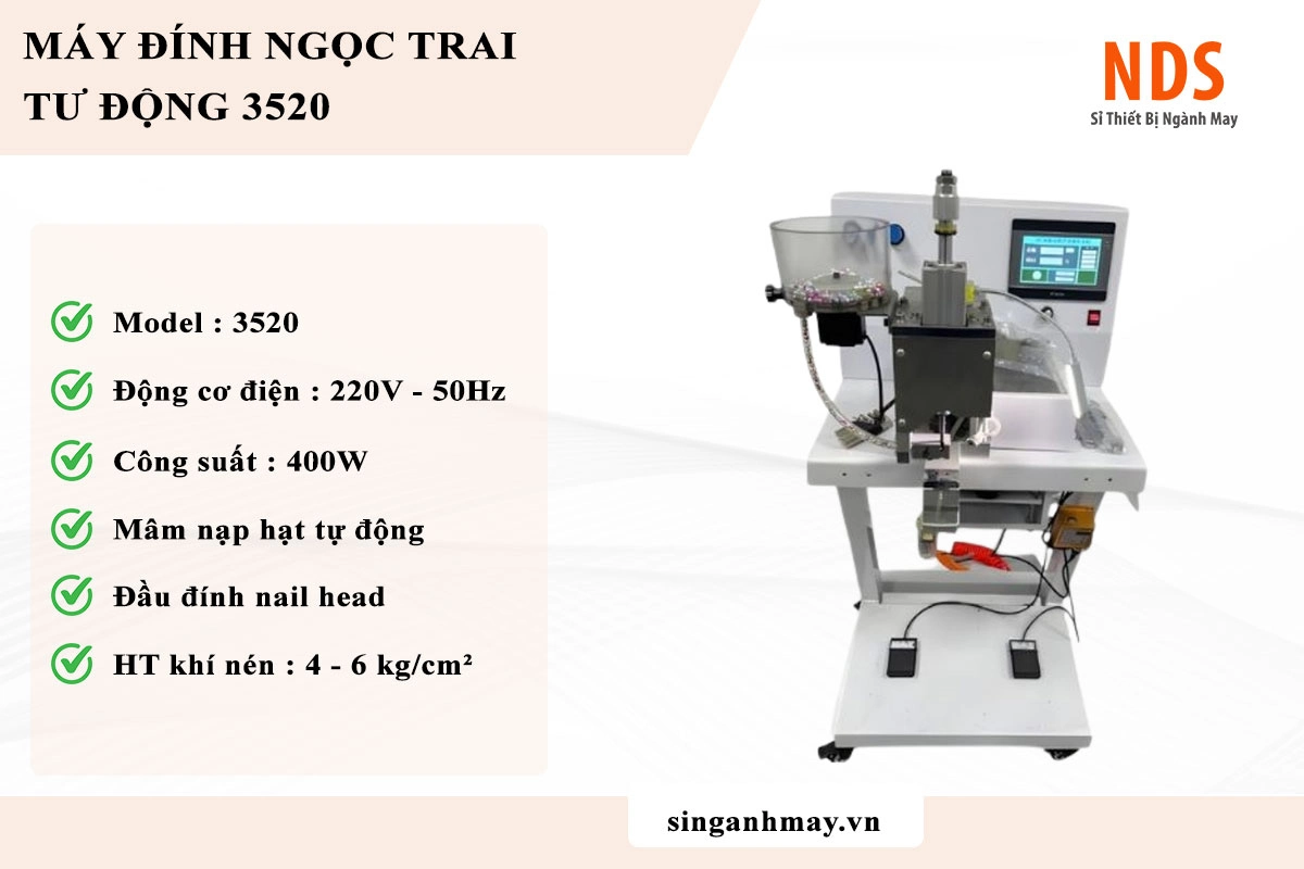 Máy đính ngọc trai tự động 3520 vận hành điện 220V kết hợp khí nén. Máy có thể đính nhiều loại hạt như ngọc trai tròn, vuông, nửa tròn và hạt trang trí đặc biệt, với tốc độ 220–300 viên/phút. Nhờ cơ cấu tán đinh cơ học, hạt được gắn chắc vào vải và giữ ổn định sau nhiều lần giặt.