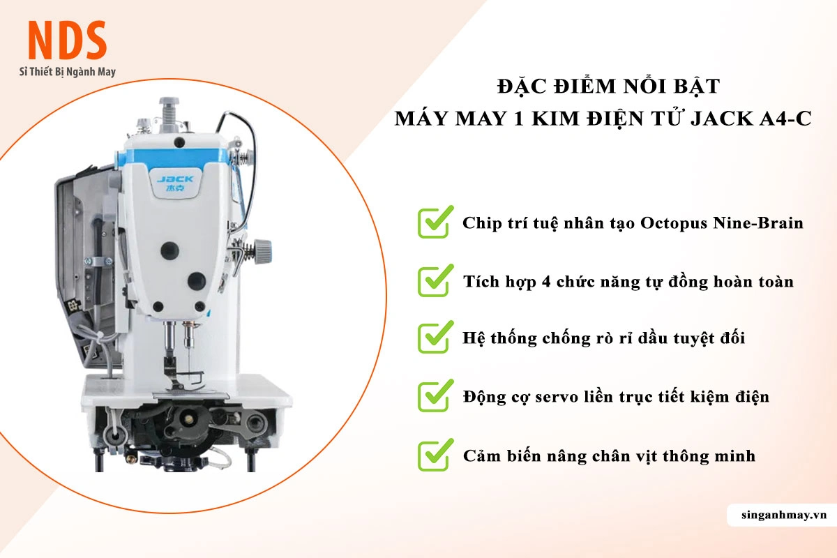 Jack A4-C là phiên bản nâng cấp thuộc dòng A4 danh tiếng của thương hiệu máy may Jack. Điểm khác biệt lớn nhất của model này chính là tích hợp công nghệ hướng dẫn bằng giọng nói (tiếng Việt), giúp người vận hành dễ dàng kiểm soát các tính năng mà không cần am hiểu quá sâu về kỹ thuật điện tử. Máy được thiết kế liền trục, gọn gàng và mang tính thẩm mỹ cao, phù hợp cho cả xưởng may công nghiệp lẫn hộ gia đình