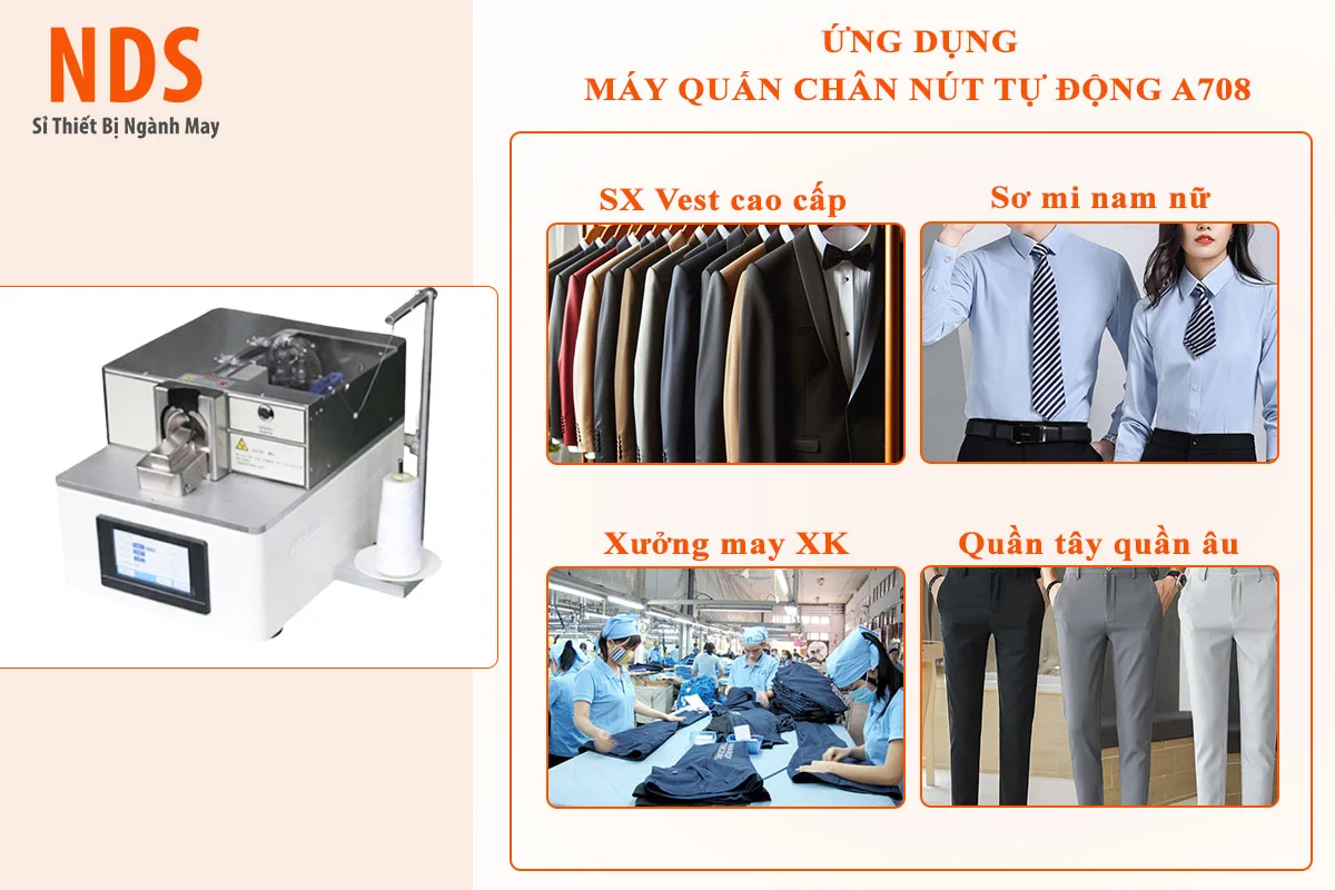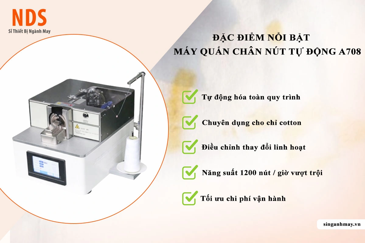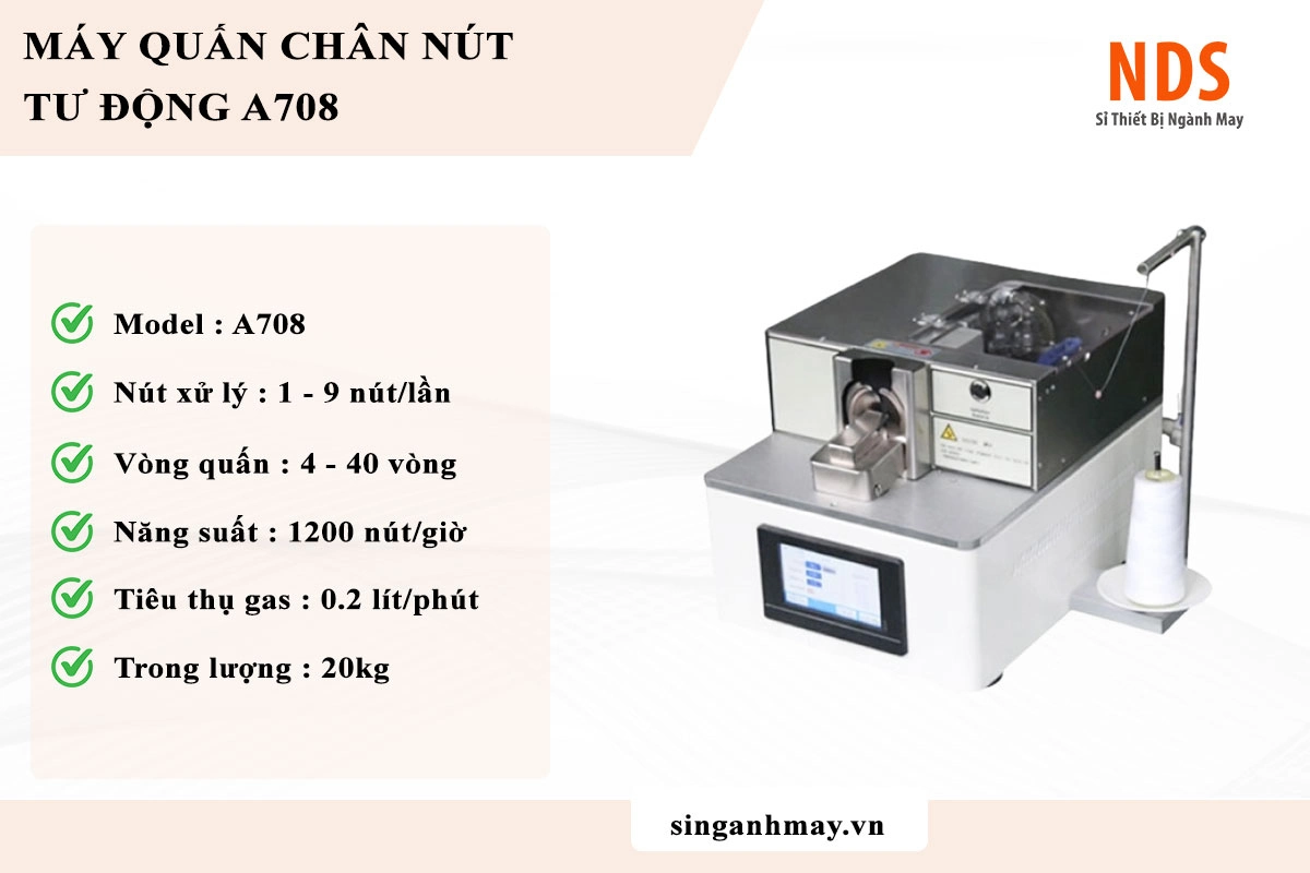 Máy quấn chân nút A708 là dòng máy chuyên dụng thế hệ mới, được thiết kế để quấn sợi quanh chân nút sau khi đã đơm vào vải. Việc này tạo ra một khoảng cách nhất định giữa nút và bề mặt vải, giúp việc cài khuy trở nên dễ dàng hơn và form áo không bị nhăn nhúm. Model A708 nổi bật với khả năng vận hành êm ái, tốc độ cao và độ chính xác tuyệt đối