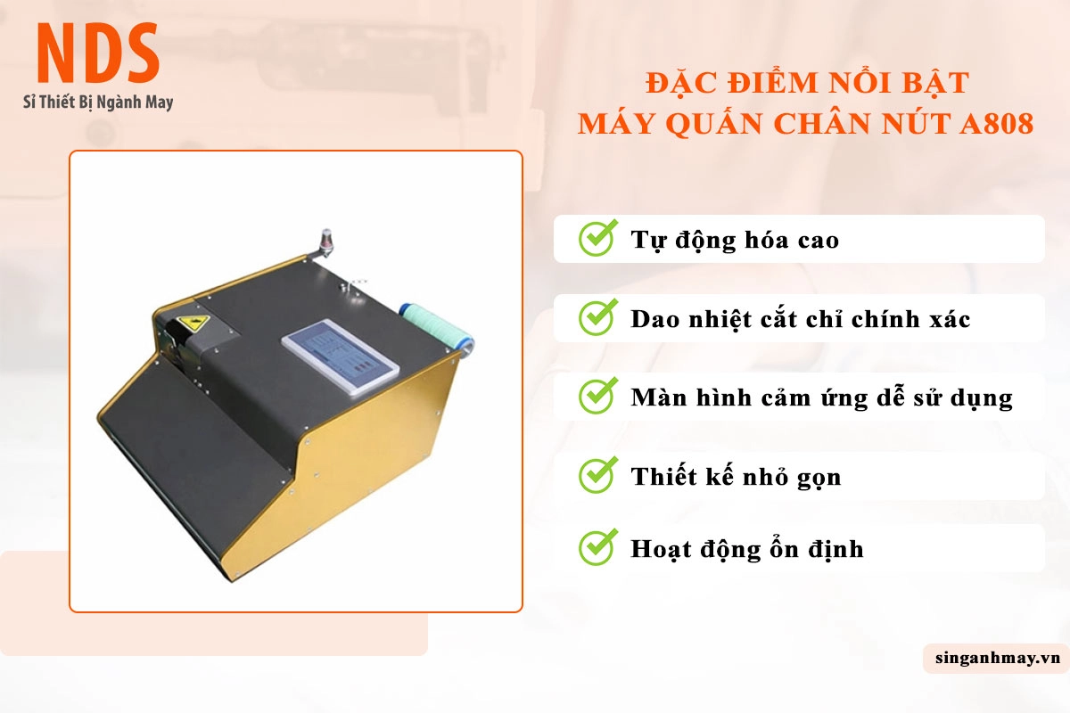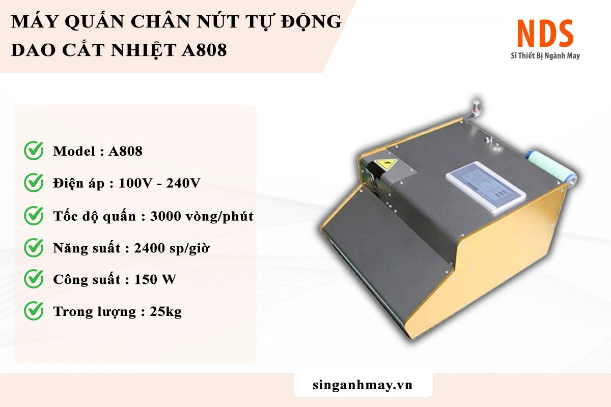 Máy quấn chân nút A808 là dòng máy tự động chuyên dụng để quấn chỉ quanh chân nút sau khi đơm. Điểm khác biệt lớn nhất của model này chính là tích hợp công nghệ cắt chỉ bằng nhiệt, giúp đầu chỉ được hàn kín, không bị tuột và cực kỳ thẩm mỹ. Đây là thiết bị không thể thiếu trong các dây chuyền sản xuất áo vest, áo khoác và các dòng thời trang cao cấp