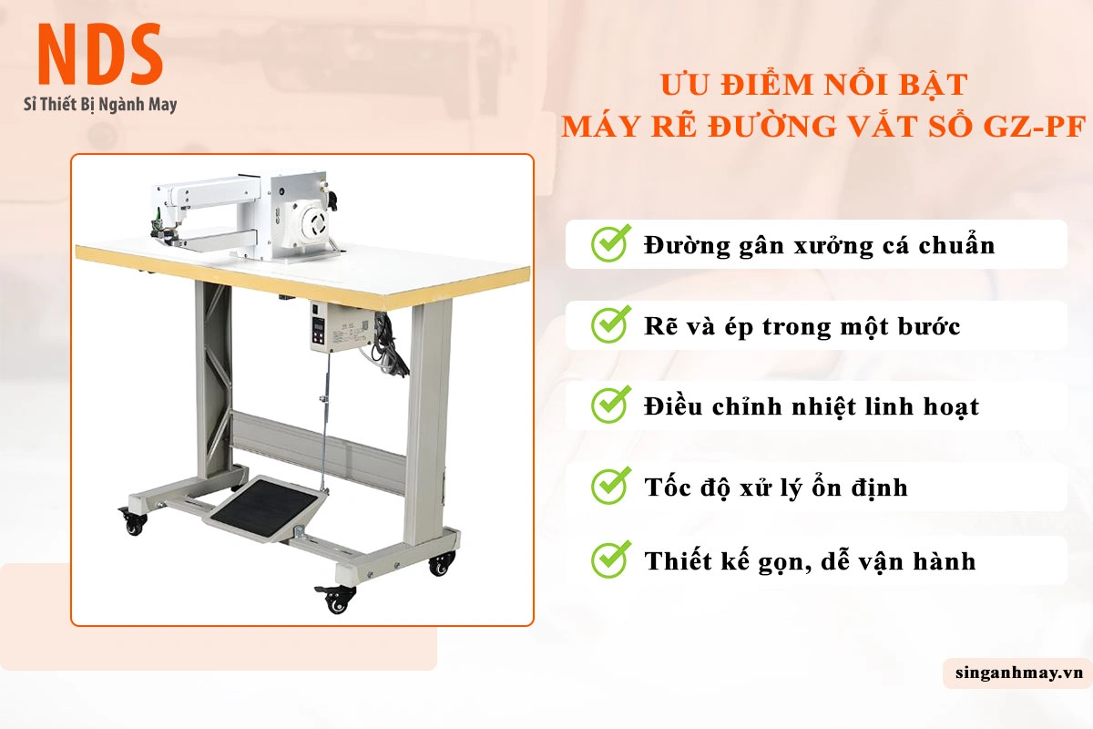 Khi sử dụng máy rẽ đường vắt sổ GZ-PF, xưởng may có thể bỏ hoàn toàn công đoạn rẽ và ủi thủ công từng sản phẩm mà vẫn giữ được đường xương cá phẳng và đồng đều trên toàn bộ lô hàng.