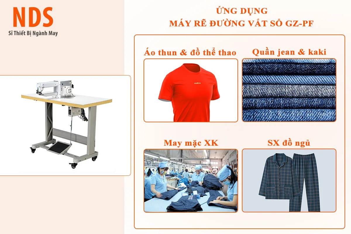 Trong nhiều xưởng may áo thun và thể thao, GZ-PF được dùng để tạo hiệu ứng xương cá trên đường nối mà không cần bàn ủi riêng hay công nhân rẽ tay.