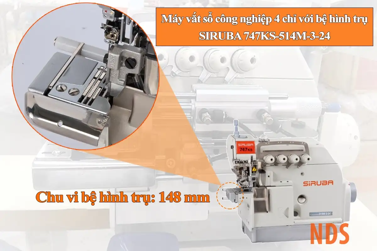 Máy vắt sổ 4 chỉ cổ nhỏ liền trục Siruba 747KS-514M-3-2 là dòng máy vắt sổ 4 chỉ cao cấp, chuyên dùng cho vải mỏng và trung bình. Đặc điểm nổi bật là thiết kế bệ hình trụ nhỏ (chu vi chỉ 148 mm), giúp máy xử lý hoàn hảo các chi tiết ống tròn nhỏ và hẹp như tay áo, cổ áo, quần trẻ em, ống tay raglan...