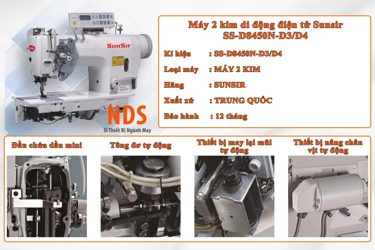 Sunsir SS-D8450N-D3/D4 là dòng máy may 2 kim di động điện tử được nhiều xưởng may vừa và nhỏ lựa chọn nhờ giá thành hợp lý nhưng vẫn đảm bảo hiệu suất ổn định