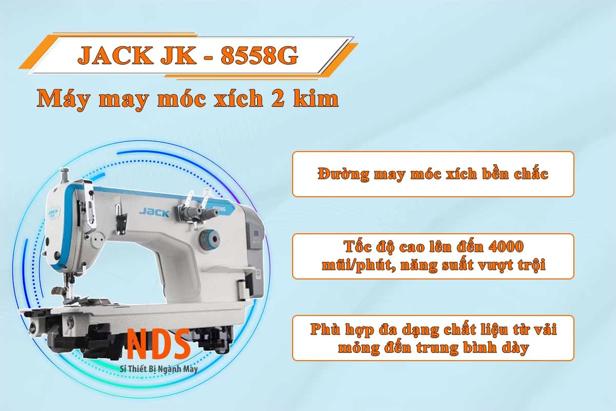 Jack JK-8558G là dòng máy may 2 kim móc xích, được thiết kế để giải quyết bài toán đường may đàn hồi và hạn chế đứt chỉ – vấn đề thường gặp khi may vải co giãn