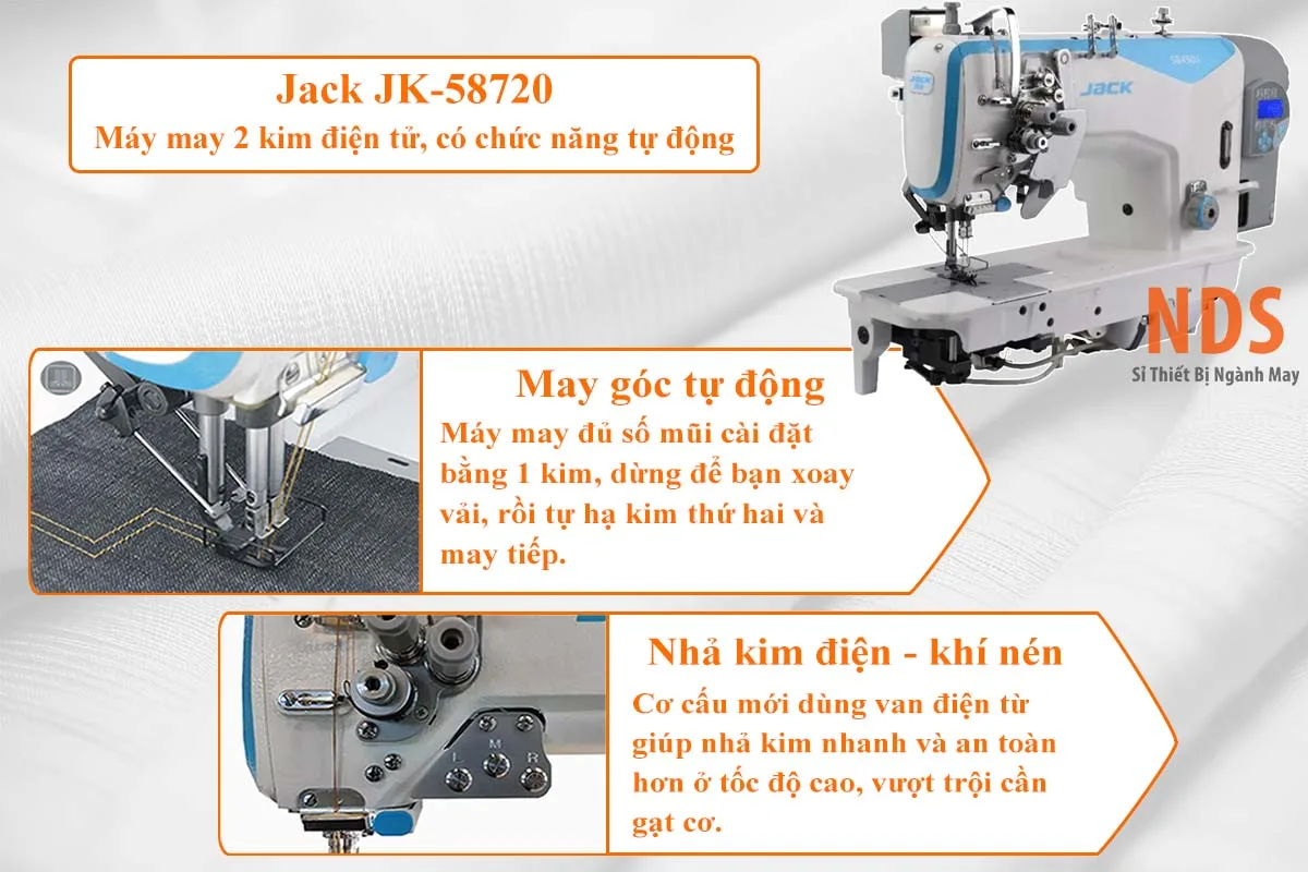 Jack JK-58720 là một trong những dòng máy may 2 kim liền trục ổ ngựa di động được đánh giá rất cao trong phân khúc máy may công nghiệp trung cao cấp. Dòng máy này được sử dụng phổ biến tại các xưởng may sản xuất hàng loạt nhờ độ ổn định và độ bền vượt trội