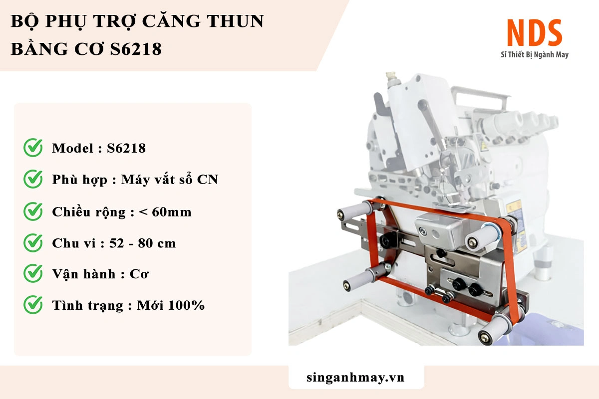 Bộ phụ trợ căng thun bằng cơ S6218 là thiết bị chuyên dụng lắp cho máy vắt sổ công nghiệp, giúp căn chỉnh và giữ ổn định thun trong quá trình may. Sản phẩm mới 100%, thiết kế tối ưu cho dây chuyền may áo thun, quần thun và sản phẩm co giãn.
