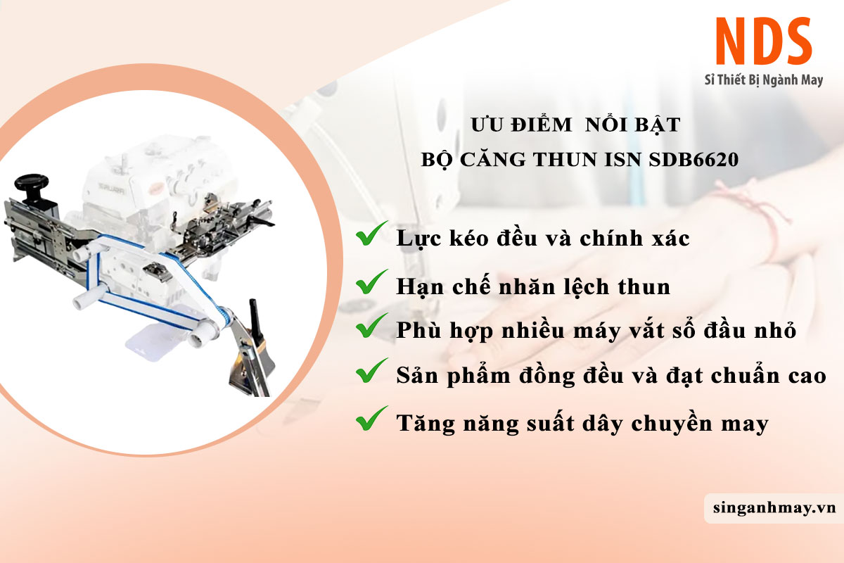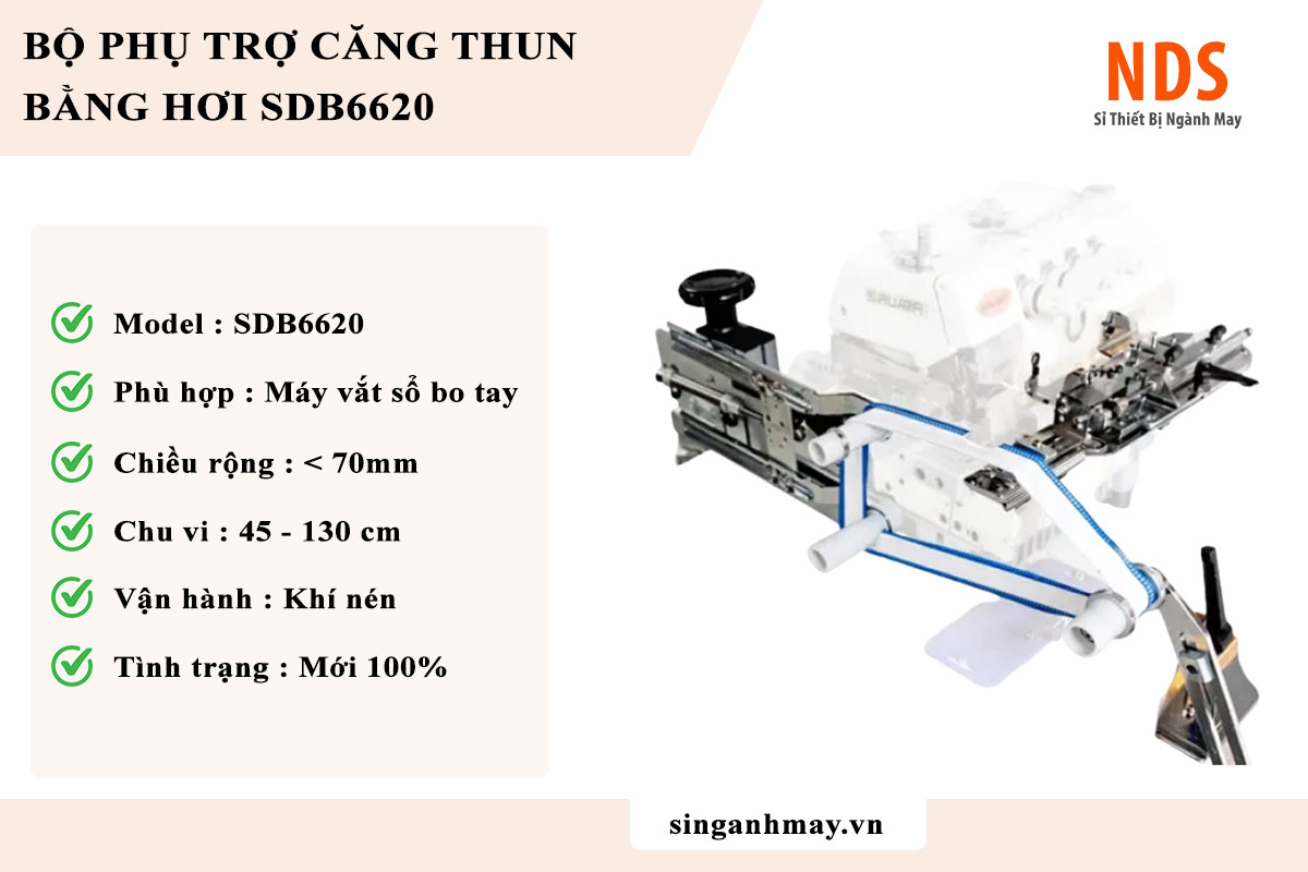 Bộ phụ trợ căng thun bằng hơi SDB6620 là thiết bị chuyên dụng lắp cho máy vắt sổ bo tay đầu nhỏ, giúp tự động kéo và căn chỉnh thun chính xác trong quá trình may. Sản phẩm mới 100%, vận hành bằng khí nén, phù hợp cho các xưởng may sản xuất áo thun, đồ thể thao và hàng xuất khẩu.