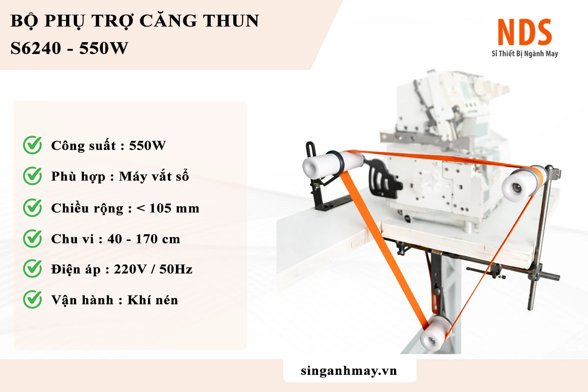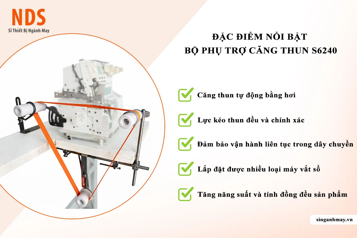 Bộ phụ trợ căng thun S6240 là thiết bị chuyên dụng lắp cho máy vắt sổ, máy vắt sổ đầu nhỏ và các dòng máy may có bàn chữ U, giúp tự động kéo và căn chỉnh thun chính xác trong quá trình may.