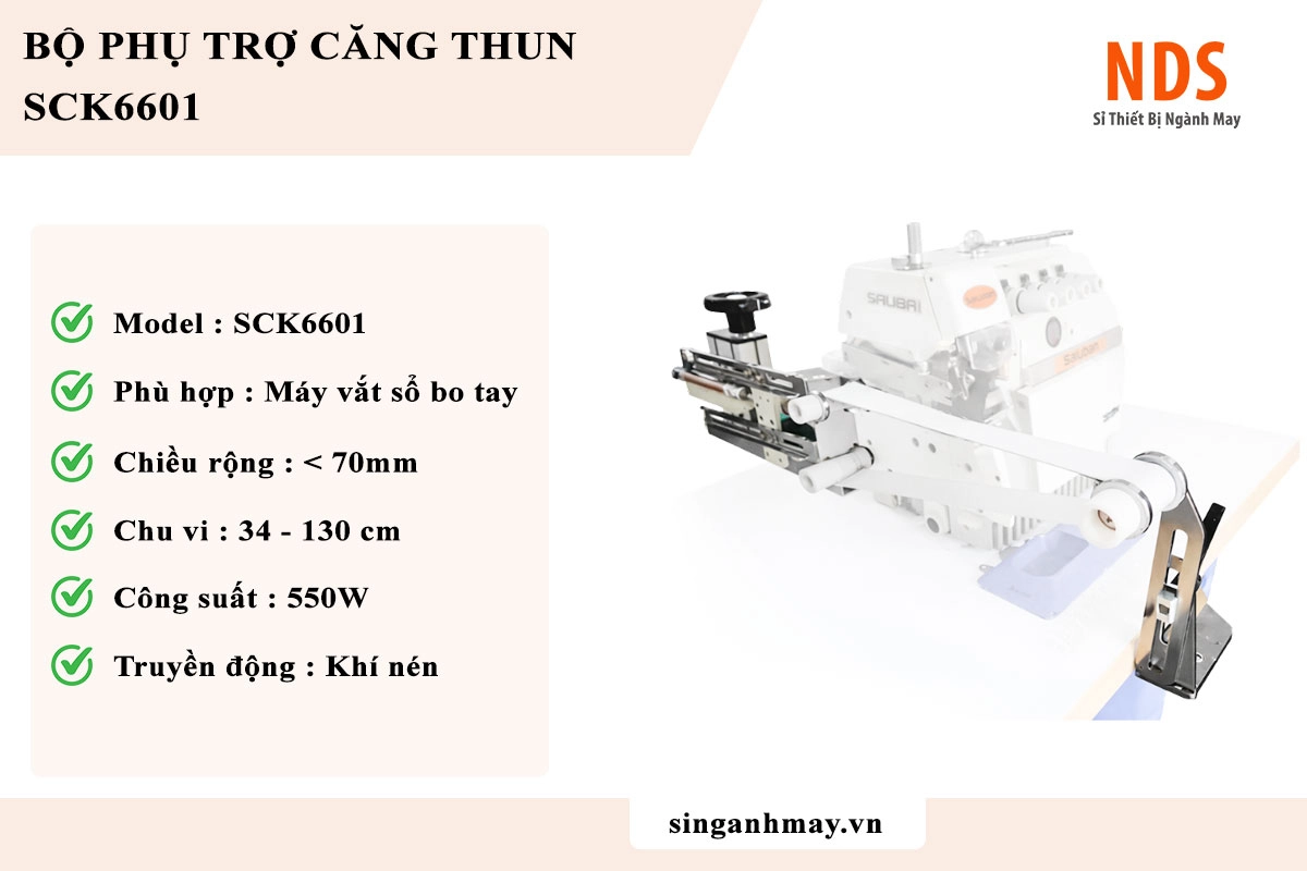 Bộ phụ trợ căng thun SCK6601 là thiết bị chuyên dụng lắp cho máy may công nghiệp / máy vắt sổ bo tay, giúp tự động căn chỉnh và căng thun chính xác trong quá trình may. Sản phẩm mới 100%, thương hiệu ISN, vận hành ổn định với công suất 550W – điện áp 220V, kết hợp hệ thống khí nén giúp lực căng đều và chính xác.