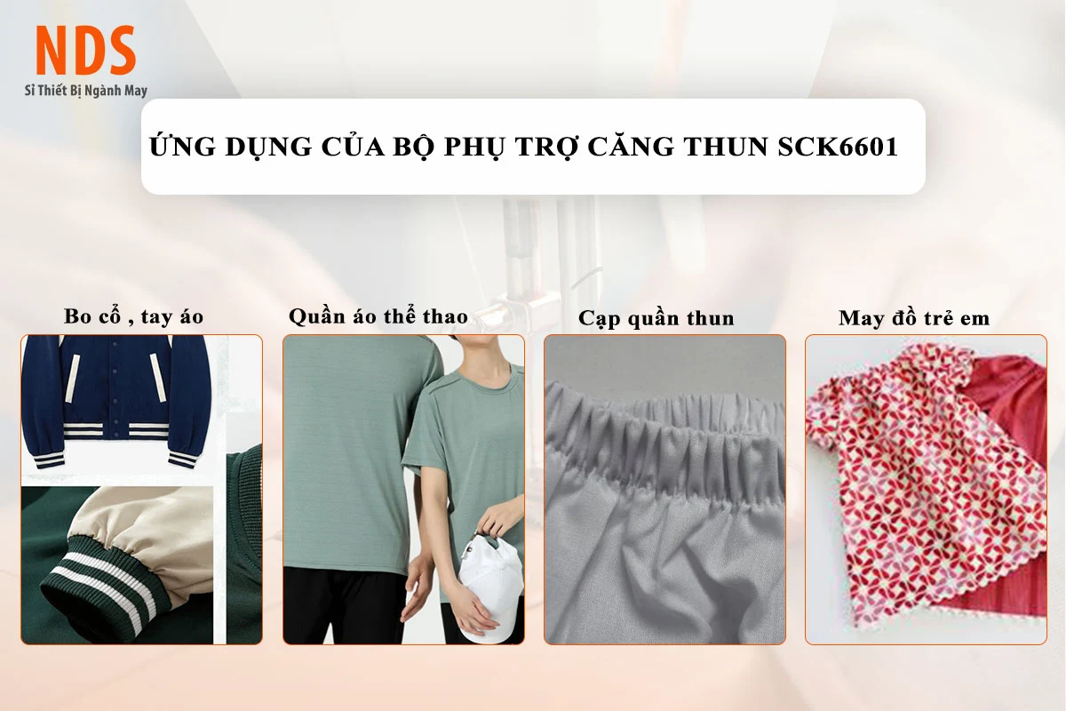 Thiết bị đặc biệt phù hợp cho công đoạn bo tay áo, bo cổ áo, cạp quần thun, giúp tăng năng suất và giảm lỗi nhăn lệch trong sản xuất hàng loạt.