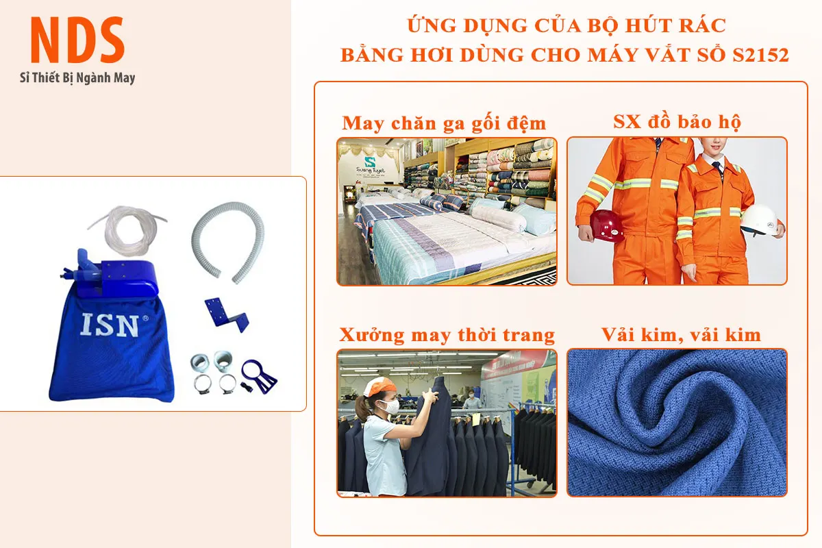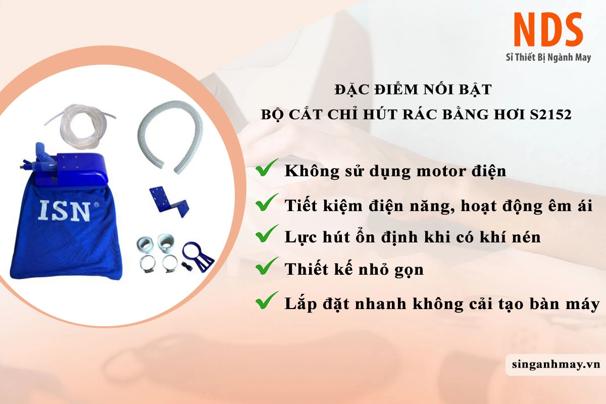 Bộ hút rác S2152 (hay còn gọi là bộ hút chỉ thừa, hút bụi vải) là thiết bị ngoại vi chuyên dụng được lắp đặt thêm vào các dòng máy vắt sổ công nghiệp. Thiết bị sử dụng áp suất khí nén để tạo lực hút mạnh mẽ, thu gom toàn bộ phần vải thừa và bụi bẩn ngay khi dao cắt hoạt động