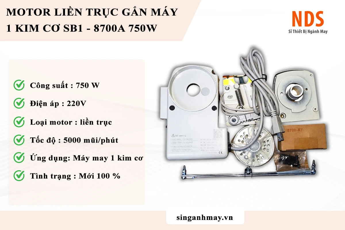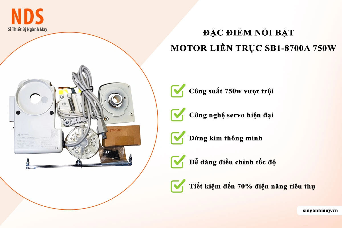 Motor liền trục SB1-8700A là dòng motor servo thông minh được thiết kế để lắp trực tiếp vào trục chính của máy may 1 kim cơ (như dòng Juki 8700 và các dòng tương đương). Điểm khác biệt lớn nhất của model này là công suất mạnh mẽ lên tới 750W và đi kèm bộ cấp thun gắn bên trên, hỗ trợ tối đa cho các công đoạn may quần áo lót, đồ thể thao hoặc ga gối